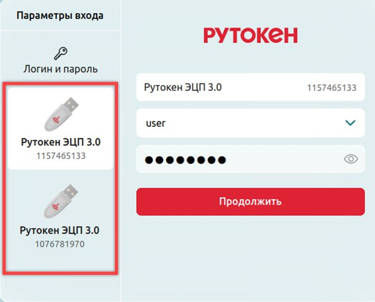 Подключаете токен — выбираете его на экране.