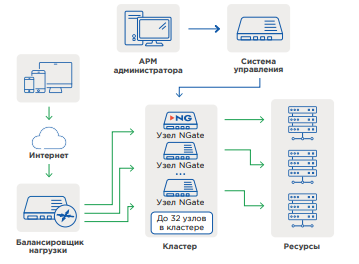 Один узел шлюза КриптоПро NGate способен поддерживать до 45 000 соединений с обработкой информационных потоков до 20 Гбит/с в режиме TLS-шлюза. Кластер может содержать до 32 узлов.