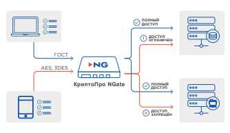 КриптоПро NGate (далее – NGate) реализует российские криптографические алгоритмы, сертифицирован ФСБ России по классам КС1, КС2 и КС3. Это позволяет использовать