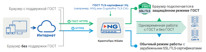 КриптоПро NGate обеспечивает одновременную поддержку TLS как с отечественными, так и зарубежными криптоалгоритмами. Это позволяет реализовать плавную миграцию механизмов защиты доступа к веб-сайтам на ГОСТ.
