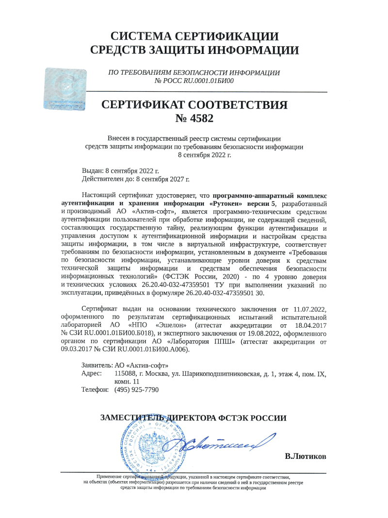 Имеет Сертификат ФСТЭК на Рутокен ЭЦП 3.0 3220 Type-C № 4582